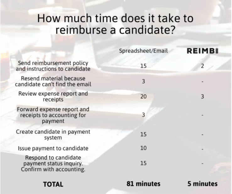 Think about all of the steps involved in reimbursing a job candidate for expenses and how many people are involved. Talking to our customers about their process before Reimbi, an estimate has been made that it takes about 81 minutes to reimburse a candidate.